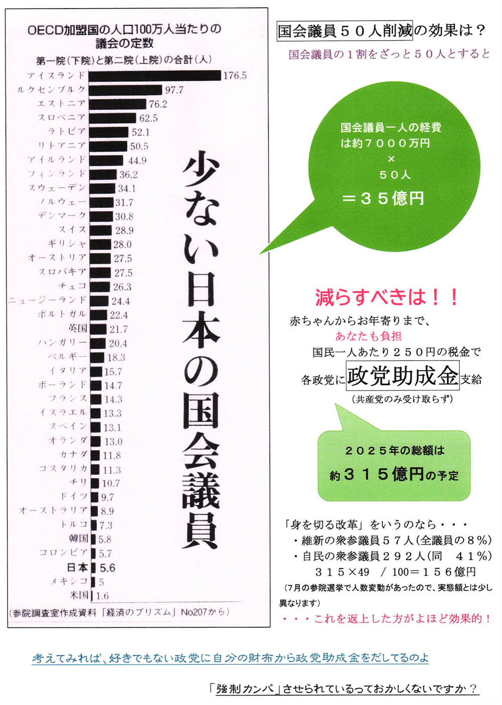 維新が「政治とカネ」で態度を変身したことへの批判をそらすため持ち出してきた衆院議員定数1割削減(ねらいは比例定数)を、しかもこの臨時国会中に成立させるとしたことは大問題です。幅広い民意を反映させる仕組みとしての比例定数を12月17日までの会期でゴリ押しするというのは、議会制民主主義を内容・手続きの面で二重に踏みにじるものです。そもそも人口当たり国会議員定数で日本はOECD38ヶ国中36番目なのです。また仮に国会議員50人減らしても37.5億円程度であり、「身を切る改革」というのであれば政党助成金(25年は315億円)を廃止するほうがよほど効果的です。