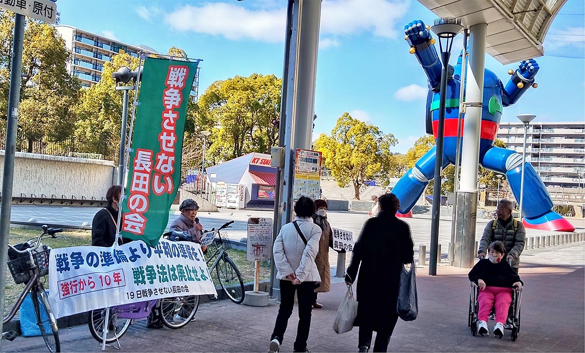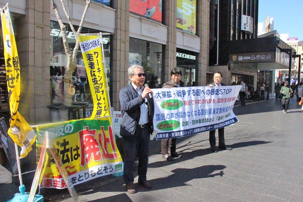2月19日神戸大丸前で戦争法廃止求める定例宣伝では、近藤暢朗・吉田維一・松山秀樹の3弁護士も参加し、人々にうったえました。